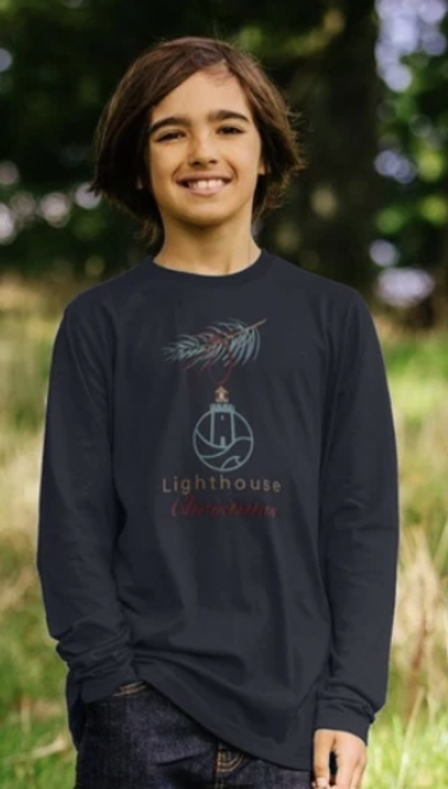 A cozy Christmas themed organic long sleeved t-shirt for the kids in midnight blue!