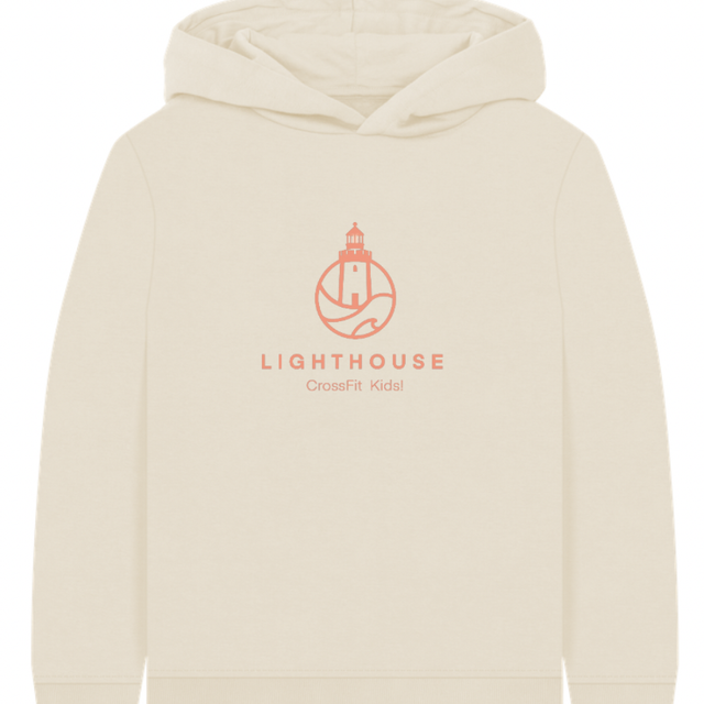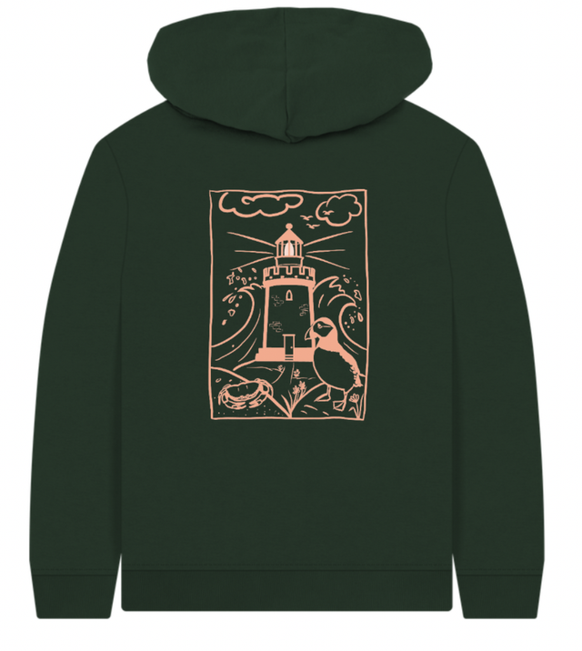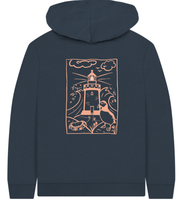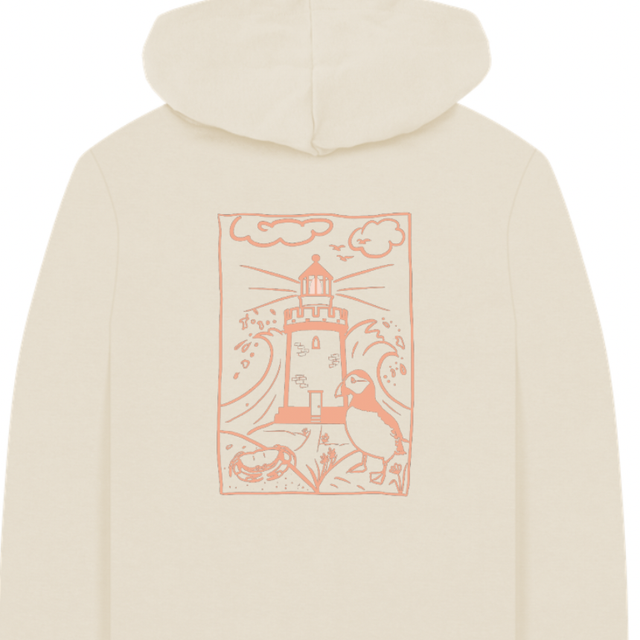 Lighthouse Adventure Fitness Organic Cotton Hoodie With Peach Logo and Puffin